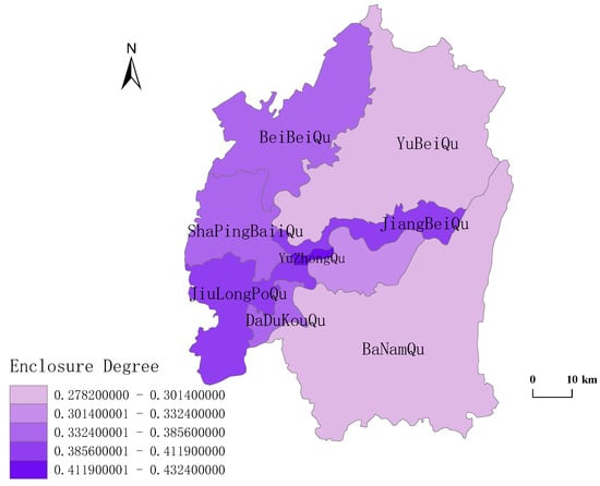 Interface enclosure refers to the degree of closure in urban streets or areas, often associated with a sense of security and clearly defined boundaries. As shown in Figure 14, Yuzhong District has the highest level of interface enclosure, with a more closed street layout, possibly indicating a commercial or central area with a strong sense of separation. Jiulongpo District and Jiangbei District also exhibit relatively high levels of enclosure, suggesting well-defined boundaries and more spatial separation. In contrast, Yubei District and Banan District show lower levels of interface enclosure, implying a greater sense of openness and better connectivity between neighborhoods.