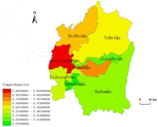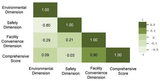 Figure 16 illustrates the Pearson correlation coefficients for the multi-dimensional features within the study area. The comprehensive score exhibits a notable positive correlation with the facility convenience dimension, whereas it reveals only weak correlations with the environmental and safety dimensions. The feature vectors indicates that Yuzhong District, Jiangbei District, and Jiulongpo District have superior safety metrics, which are labeled as “safe”. Beibei District and Yubei District are distinguished by their exceptional environmental qualities and are labeled as “beautiful”. Shapingba District and Yuzhong District are characterized by high levels of facility convenience and are labeled “convenient”. Conversely, Nan’an District and Ba’nan District are noted for their low vehicle density and expansive skies, thus being categorized under the “landscape-oriented” label.