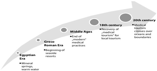 The revival of medical tourism occurred during the 18th century. Medical tourism experienced a recovery in Bath, Britain, when affluent Europeans embarked on journeys to avail themselves of the therapeutic attributes of water while simultaneously asserting their social standing. Napoleon III of France initiated a new enthusiasm for the thermal advantages of water. During the early 20th century, the French Riviera, renowned for its conducive climate for therapeutic purposes, garnered significant attention from affluent individuals. Over the course of time, novel patterns have arisen from this form of tourism [2]. The tourism industry experienced significant transformations following World War II, characterized by advancements in social, political, economic, and logistical aspects. These changes led to a rise in tourist activity, leisure, and entertainment. Over time, tourism has begun to divide into various specialized markets, with medical tourism experiencing notable growth [2]. A historical perspective on medical tourism is shown in Figure 1.