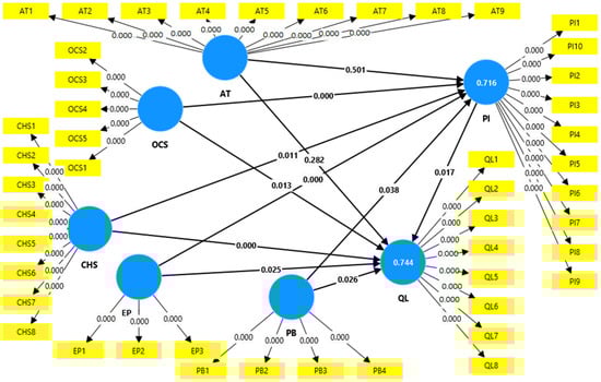 Before evaluating the structural model, it is essential to first check the measurement model for potential multicollinearity issues. Multicollinearity occurs when independent (exogenous) variables are highly correlated, which can distort the results of the analysis. To detect multicollinearity, this study analyzed both the Variance Inflation Factor (VIF) and tolerance values. The general rule of thumb suggests that VIF values should be 5 or lower, while tolerance values should be 0.20 or higher to avoid multicollinearity issues [48,49]. In this study, all exogenous variables had VIF values below 5, and tolerance levels were greater than 0.20, confirming the absence of any multicollinearity problems. This ensures that the relationships among the variables are stable and reliable, allowing for a more accurate assessment of the structural model [44,50].