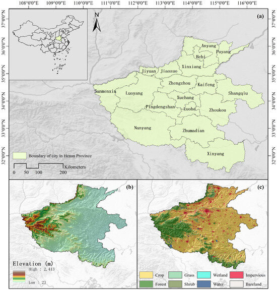 Regional context and overview of Henan Province, China. (a) Location map and administrative map. (b) Digital elevation model map. (c) Land cover classification map.