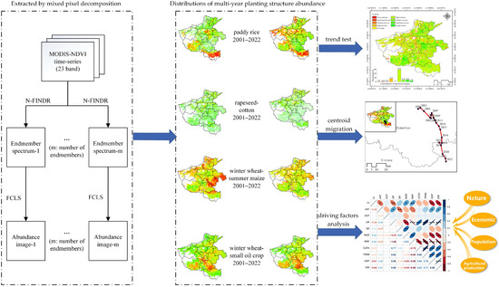 The primary framework for analyzing the evolution trends and driving factors, at a sub-pixel scale, of planting structure information of main grain crops is provided in Figure 2. Firstly, based on the phenological differences of various crops in the time series profiles, the mixed-pixel decomposition method of N-FINDR [25] combined with the fully constrained least squares (FCLS) [26] method was used to extract the spatial distribution information of crop planting structures in Henan Province from 2001 to 2022. Secondly, by calculating the cropping index (CI), the dynamic evolution of crop planting structures over 22 years was investigated. Finally, the correlation between the cropping index and ten driving factors was analyzed from the perspectives of natural factors, economic factors, population factors, and agricultural production factors.