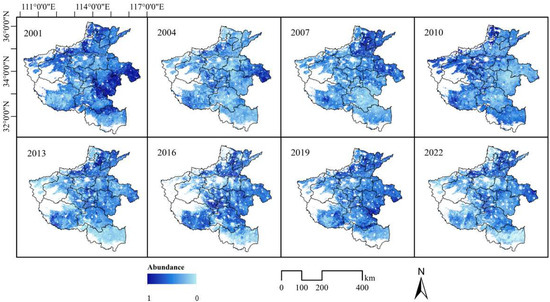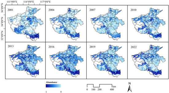 Figure 5 and Figure 6 show the spatial distribution of abundance values for winter wheat–summer maize and for winter wheat–small oilseeds, respectively. Winter wheat is the main crop in Henan Province during the winter, while corn is the primary crop during the summer. The spatial distribution of winter wheat–summer corn covers all prefecture-level cities in Henan. The spatial distribution of this cropping pattern has remained largely stable from 2001 to 2022, underscoring the predominant and consistent role of the winter wheat–summer maize rotation in Henan’s agricultural landscape. Small oilseeds, such as soybeans and peanuts, are also major summer crops in Henan, and their planting pattern rotates with winter wheat due to differences in planting phenology. The winter wheat–small oilseeds planting areas are mainly concentrated in the central and eastern plains of the province, including prefecture-level cities like Zhumadian, Nanyang, and Shangqiu. In terms of planting areas, the acreage of corn and small oilseeds in the summer is generally complementary, as crop prices can influence farmers’ planting preferences. Between 2001 and 2013, the cultivated area for winter wheat and small oilseed crops experienced a substantial expansion, particularly in the eastern plains region. From 2016 to 2022, the spatial distribution of these crops has tended to stabilize, with high-density cultivation areas persisting in the central and eastern plains. This suggests that the land use within this agricultural system has undergone significant optimization.