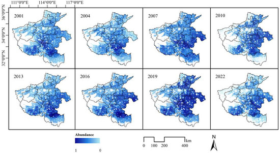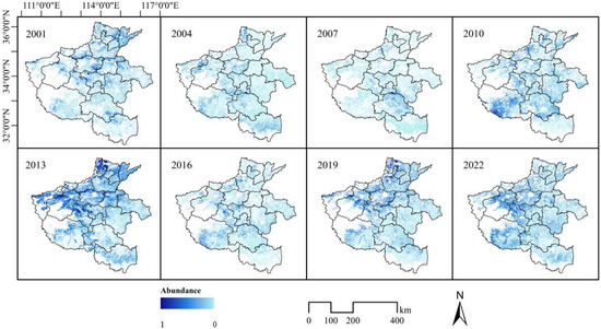 Paddy rice abundance distribution in Henan Province over multiple years.