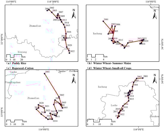 Analyzing the centroids and migration patterns of different crop planting structures provides insight into the planting habits and main grain areas within the study region. The migration trajectories can elucidate the relationship between crop planting structures and driving factors. In this study, the cumulative abundance values of different crop planting structures were calculated at the prefecture-level city scale in Henan Province, serving as the weights for the centroid. The centroids and migration patterns of different cropping structures were then determined based on the weights. Figure 7 shows the centroids and their migration trajectories for various crop planting structures from 2001 to 2022.