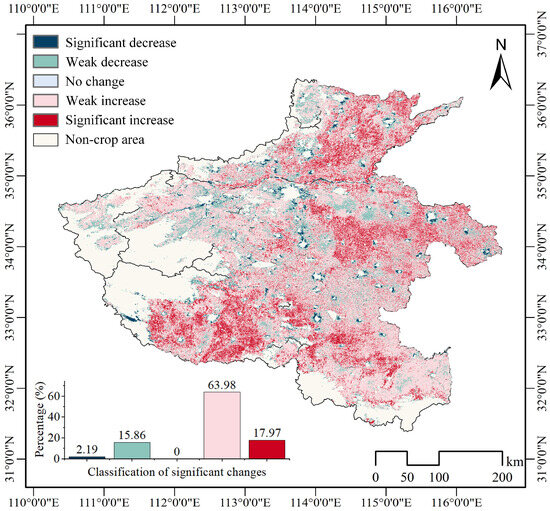 Figure 8 shows the trend changes and distribution of the cropping index in Henan Province over the 22 years starting from 2001. The overall trend shows an increase, with the areas of the cropping index increasing significantly and outnumbering those with a decrease. Specifically, areas with a weak increase account for nearly 64%, while those with a weak decrease make up 14.9%, and regions with no change are minimal: numerically close to 0%. The regions with a decrease are mainly distributed around urban areas and some mountainous regions in Henan Province. This is because each year’s data are masked according to cultivated land classification data, and relevant endmembers are added during the unmixing process to prevent interference from other land cover types. The results indicate that cultivated land around cities decreases with urbanization, leading to a significant decrease in the cropping index, with a significant decrease at 2.19%. Additionally, the high proportion of weak increases suggests that farmers’ planting intentions and habits have remained largely unchanged. Henan Province’s cropping structure continues to be dominated by single-season rice and double-season winter wheat and summer crops in rotation.