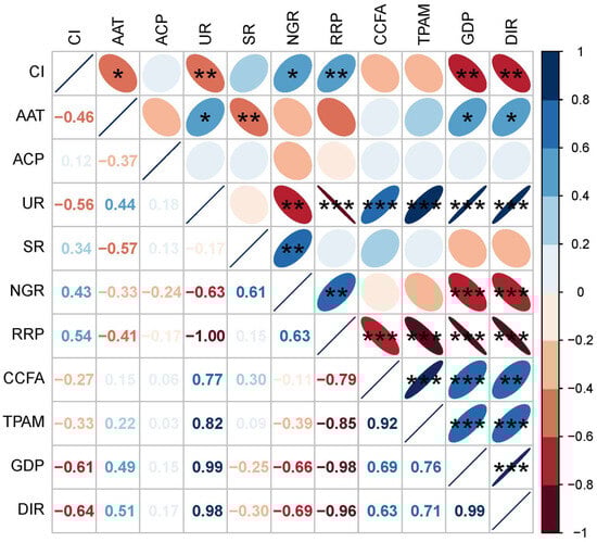 Pearson’s correlation coefficient of cropping index and 10 driving factors. The color and ellipses of the elliptical glyphs denote the magnitude and the direction of the relationship. The shorter the short axis, the closer the correlation coefficient is to 1 and vice versa. The bluer the color is, the stronger the positive correlation. The asterisk indicates the significance level of the correlation (* p < 0.05; ** p < 0.01; *** p < 0.001). CI, cropping index; AAT, annual average temperature; ACP, annual cumulative precipitation; UR, urbanization rate; SR, sex ratio; NGR, natural growth rate; RRP, resident rural population; CCF, consumption of chemical fertilizers; TPAM, total power of agricultural machinery; GDP, gross domestic product; DIR, disposable income of rural residents.