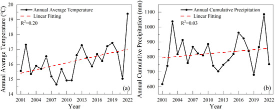 Natural driving factors from 2001 to 2022. (a) Annual average temperature. (b) Annual cumulative precipitation.