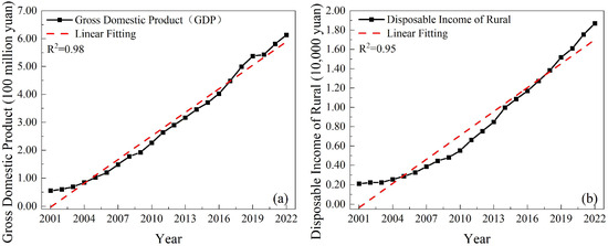Economic driving factors from 2001 to 2022. (a) Gross domestic product. (b) Disposable income of rural residents.