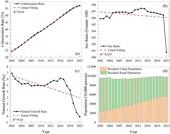 Population driving factors from 2001 to 2022. (a) Urbanization rate. (b) Sex ratio. (c) Natural growth rate. (d) Population.