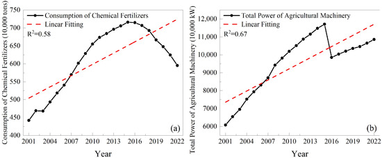 Agricultural production process driving factors from 2001 to 2022. (a) Consumption of chemical fertilizers. (b) Total power of agricultural machinery.