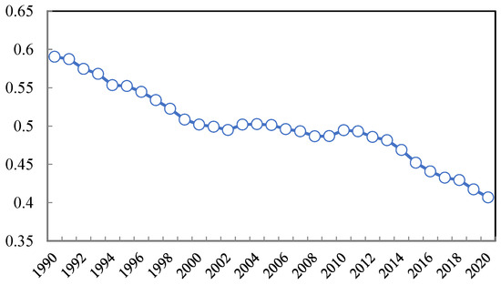 Since the Industrial Revolution, emissions of greenhouse gases such as CO2 have soared in various countries and extreme climate events have occurred frequently in various places, which not only affects the ecosystem but also poses a serious threat to the lives and property of human beings. Figure 1 shows the data of carbon dioxide emissions (kg per USD 2015 of GDP) collected from World Bank. We can see that the global unit CO2 emissions are decreasing from 1990. In 1990, the global CO2 emissions were 0.59 kg per USD 2015 of GDP, and in 2020, it decreased to 0.41 kg per USD 2015 of GDP.