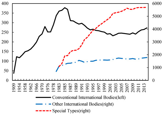Figure 2 shows the number of different intergovernmental organizations from 1909 to 2013. We collect the data from past editions of the Yearbook of International Organizations released by the Union of International Associations (UIA). We can see that conventional international bodies of IGOs increased rapidly before the 1980s, especially after World War II, while special types of IGO have always been the largest proportion and established faster than other international bodies of IGOs.