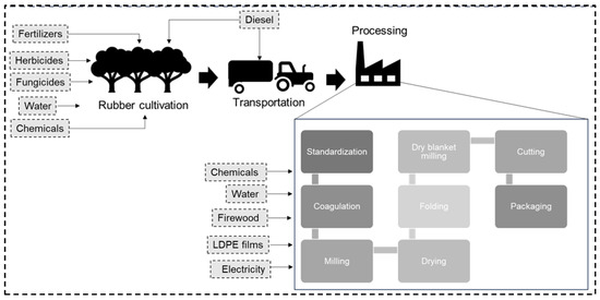 In the inventory analysis stage of the LCA, all inputs and outputs associated with the life cycle stages of crepe rubber production were identified and quantified. In the assessment, two types of inventory data were gathered: foreground and background. The foreground data pertained specifically to the system under analysis, while the background data served as inputs for the evaluation but are not specific to the product being evaluated. In Figure 1, processes related to the foreground system are depicted in a darker shade, whereas those associated with background systems are shaded in lighter colors.