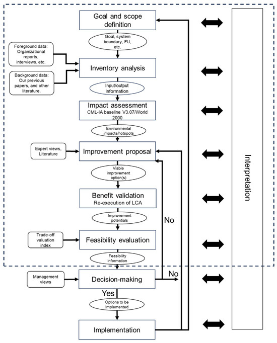 Life cycle assessment (LCA) is widely recognized as a comprehensive approach for evaluating the environmental impacts of products and services throughout their life cycle and has been the most advanced and tried-and-true methodology for assessing the environmental burden of processes or products. It follows the ISO 14040/44 standards [20] and accordingly, we trailed the steps of goal and scope definition, inventory analysis, impact assessment, and interpretation.