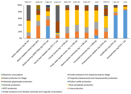 The impact assessment results for the cultivation and processing phases, and overall production are shown in Figure 3 and Figure 4, and Table 5, respectively. According to Figure 3, the impacts of fertilizer production were dominant across most impact categories during the cultivation phase (i.e., abiotic depletion, human toxicity, freshwater aquatic ecotoxicity, marine ecotoxicity, terrestrial ecotoxicity, photochemical oxidation). Specifically, the production of phosphorus fertilizer makes notable contributions in this regard. For instance, human toxicity is dominated by thallium and arsenic released into the water during sulfuric acid production in the upstream segment of phosphorus fertilizer production. However, urea production has become the primary driver of abiotic depletion (fossil fuels) because of natural gas consumption in ammonia production in the upstream portion of the supply chain (N.B., ammonia was used as the hydrogen source). The depletion of the ozone layer was dominated by the production of herbicides (tebuconazole and hexaconazole). This was attributed to the CFC-12 gas released from dichloromethane production in the upstream supply chain of the above herbicide. Furthermore, the impacts of on-site emissions are the dominant factors for acidification and eutrophication owing to the release of NH3 and NO3− from fertilizer use. To be specific, NH3 emissions to air from urea use dominated ca. 69% of acidification, and NO3− to water from the same contributed ca. 58% of eutrophication. However, phosphorous releases to water from rock phosphate use indicated ca. 7% contribution to eutrophication. The GWP category also showed some dominance from on-site impacts, stemming from the N2O and CO2 emissions associated with fertilizer use at the site.