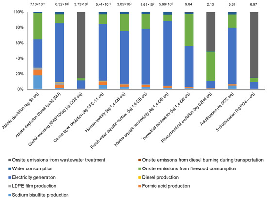 In the raw rubber processing phase (Figure 4), electricity generation was the dominant factor across most impact categories, except for global warming potential, terrestrial ecotoxicity, photochemical oxidation, and eutrophication. In these cases, GWP and eutrophication were affected by CH4 (released to air due to anerobic digestion) and NO3− (released to water) from the wastewater treatment plant, respectively. Terrestrial ecotoxicity and photochemical oxidation are influenced by the chromium released into the soil from ash and the CO released into the air from firewood use, respectively.