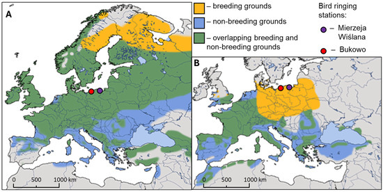 The geographical range of Goldcrest (A) and Firecrest (B), and the location of the two bird ringing stations of the Operation Baltic project in Poland, which provided data analyzed in this paper (maps after Trepte [28] modified).
