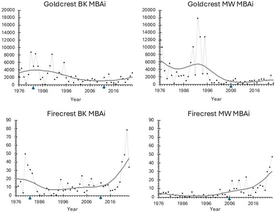 The long-term trends in the Migrating Bird Abundance index (MBAi), obtained using GAMs at both stations, showed a decrease in the number of Goldcrest migrating in autumn between the 1980s and 2000s, followed by a stabilization after about 2000 (BK: F = 12.081 p = 0.0012; MW: F = 14.77 p = 0.00039) (Figure 2, Table S5). The high year-to-year variation in MBAi at both stations also decreased after 2000. In contrast, the trends in MBAi for Firecrest at both stations indicated a decline in migrants’ abundance in the late 1970s and early 1980s, followed by stabilization of the observed numbers. However, the number of Firecrest caught at both stations rapidly increased since 2016 (Figure 2, Table S5). These changes in numbers of both species did not coincide with any shifts in mist-netting locations at each station (Figure 2, Appendix A).