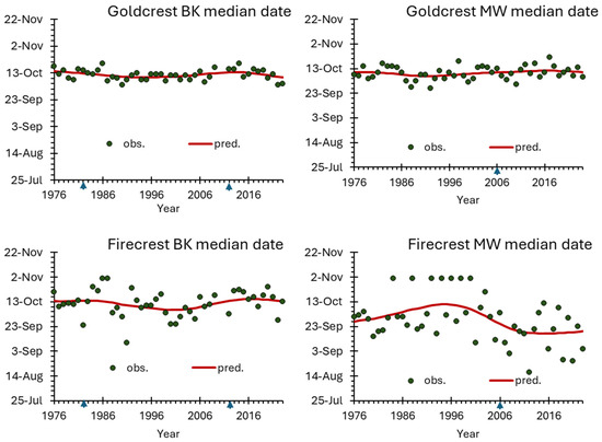 Additionally, for each species, we analyzed the dates of the passage of 50% (median) of the birds at each station in subsequent years (Tables S6–S9) to establish any changes in their autumn migration timing over the years. We checked for any long-term changes in the median date of passage using GAMs [42].