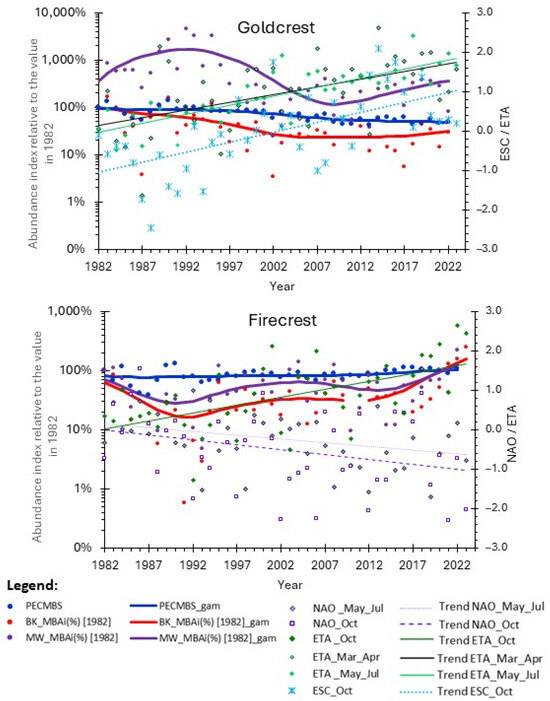 Goldcrest and Firecrest Migrating Bird Abundance indexes (MBAi) at ringing stations Bukowo-Kopań (BK) and Mierzeja Wiślana (MW) and breeding bird population indexes based on the Pan-European Common Bird Monitoring Scheme (PECBMS), against the trends in the related climate indices, during 1982–2023. Circles represent the value of each index in relation to that index in 1982, and the lines in a corresponding color represent the trend calculated with GAM. Other symbols show values of the European Temperature Anomaly (ETA), North Atlantic Oscillation Index (NAO) and Eurasian Snow Cover (ESC) averaged for indicated months; lines in corresponding colors show results of regression lines against the year. Source data and statistics are presented in Table S14.