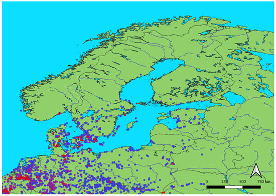 For Firecrest, the increase in their breeding abundance across Europe since the 1980s, as indicated by PECBMS, corresponds well with the increase in their numbers observed at both stations on the southern Baltic coast since the 1990s, which seemed to accelerate after about 2005 (Figure 4). Furthermore, there have been a large number of Firecrest observations from southern Sweden in 2022 by voluntary birdwatchers who submitted their records to public databases (Figure 5). These observations are in line with the increased number of Firecrest breeding in Sweden [54]. The correlation of the trends between both Operation Baltic stations confirms that this increase is not a local phenomenon but a wider pattern corresponding with that in Sweden.