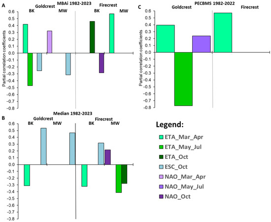 Coefficients of partial correlation (pR) between climate variables and abundance and timing for Goldcrest and Firecrest during 1982–2023 from the best multiple regression models (Table 1). (A) Relationships for Migrating Bird Abundance index (MBAi) at Bukowo-Kopań (BK) and Mierzeja Wiślana (MW) during autumn migration in 1982–2023; (B) Relationships for the median date of autumn migration at these stations in 1982–2023; (C) Relationships for the breeding population indices based on the Pan-European Common Bird Monitoring Scheme (PECBMS) in 1982–2022. Climate indices: NAO—North Atlantic Oscillation index, ETA—European Temperature Anomaly, ESC—Eurasian Snow Cover, abbreviations of months show the periods for which these indices were averaged. Model selections by AICc are presented in Tables S22–S26. The details of the best models are presented in Table 1.