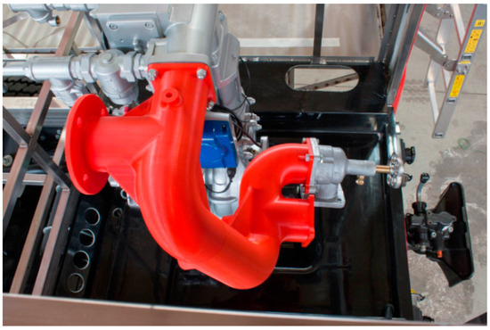 Moreover, thanks to 3D printing, vehicles that are more lightweight and fuel-efficient are being made. Manufacturers are now able to fabricate components that employ lattice structures and materials, such as aluminum alloys that are up to 80% lighter, but do not compromise on strength and safety. Put simply, metal 3D printing technology has impacted the automobile sector by making it easy to make and test new designs, fabricate difficult-to-make parts, manufacture specific parts, and develop lighter and more fuel-efficient cars. In this context, it becomes evident that the new generation of 3D printing is reshaping automotive production, making it one of the most promising enablers of progress and efficiency. Figure 3 depicts a hydraulic system inside a fire truck bearing a red colored 3D printing vacuum manifold. This manifold, which is made through a 3D printing process and fits into a pump chamber, is a prototype used to test its size, shape, and usage in the assembly of the vehicle [61].