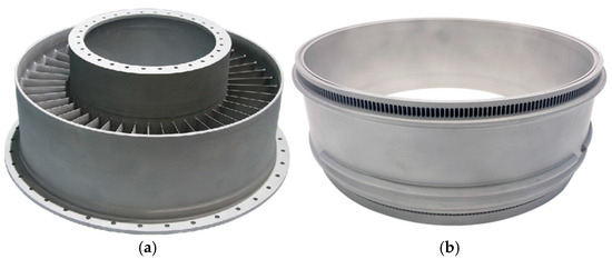 The research on alloys such as TC21 (Ti–6Al–2Zr–2Sn–3Mo1.5Cr–2Nb) and Ti5553 (Ti–5Al–5Mo–5V–3Cr) is still ongoing. Different orientations of the TC21 samples reacted as follows after heat treatment: horizontal TC21 samples exhibited a higher strength, while vertical sections had better elongation. Ti5553 alloys with an ultimate tensile strength of 1400 MPa are suitable for high-loading parts such as aircraft landing gears, wings, and rotor structures. Due to their excellent mechanical properties, these titanium alloys find applications in the manufacture of critical aerospace structures. Figure 4 displays two components made from titanium alloys fabricated using 3D printing technology. On the left (a) is the turbine blade guider, and on the right (b) is an active cooling section of an aircraft and spacecraft engine.