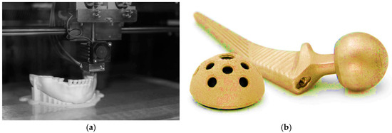 Thanks to 3D printing technology, there has been a significant improvement in the healthcare products that can be produced, such as tailor-made orthopedic implants. This degree of individualization minimizes the need for withdrawal operations or revision surgery and enhances the quality of care. Compared to conventional techniques, additive manufacturing increases the speed of production, reduces expenses, and increases the scope within which a design can be produced, making it more efficient in producing intricate parts, such as implants and surgical instruments. Developments in 3D printing will be a major factor contributing to personalized medicine while changing the face of the healthcare sector. Figure 5 illustrates two types of 3D printing applications in the field of medicine. In the left image (a), a 3D printer enables dental implants to be customized for a patient’s mouth. In the right image (b), a 3D-printed hip ball and socket joint made of titanium are shown, illustrating the advanced material and custom manufacturing approach in orthopedics [74].