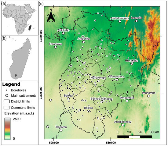 Figure 1. Location of the study area. (a) Madagascar in the context of African countries; (b) Bekily region in Madagascar; (c) boreholes with available pump test information in the Bekily region. Communes are administrative entities akin to municipalities.