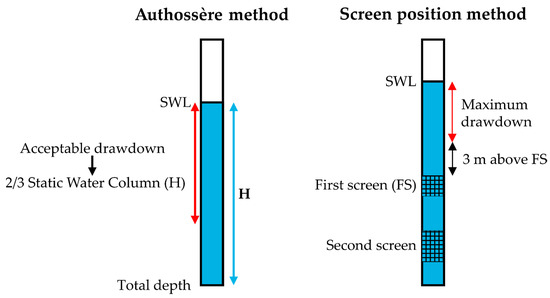 The Authossère method does not require screen position as an input [44]. The main criterion is the height of the water column inside the borehole when the dynamic drops to its minimum, and the acceptable drawdown is 2/3 of the static water column. This is based on the assumption that the screens are located mostly at the bottom of the borehole, which is considered reasonable in the vast majority of cases (it does not usually make sense to keep on drilling if the deeper aquifers traversed by the borehole are not to be exploited). In other words, if the screens are mainly located in the lower part of the borehole, depressing the initial water column by one-third should imply that there is always water inflow through most of the screens.