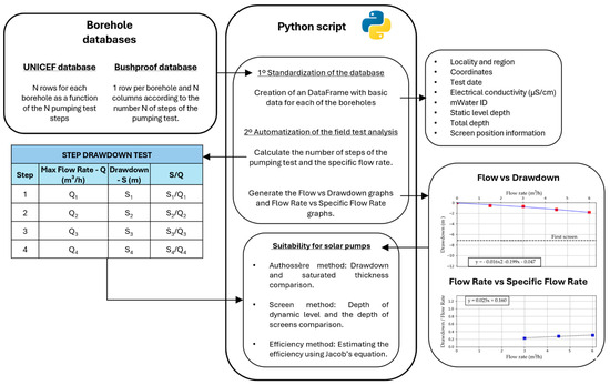 This kind of analysis inevitably requires large datasets. The importance of developing groundwater databases for the proper management of this resource is frequently advocated [16]. Data are needed to take action and make decisions, but also need to be presented in a correct and organized way so that it can be used more effectively [17]. In recent decades, the development of large databases has demanded the application of big data techniques and automation procedures with the objective of enhancing the processing of a substantial quantity of information. In this sense, the semi-automation of pumping test analysis is proposed in the ensuing pages. The main aim of this paper is to present an approach to select those boreholes where hydrogeological conditions are suitable for the installation of solar pumps and where it is thus feasible to improve water supply. This method relies on a large database of pumping tests and combines a series of classic hydraulic techniques to estimate whether borehole yield is suitable to sustain a solar pump based on the required yield for medium and large rural communities. We combine three different approaches. The first two, namely the Authossère method and the uppermost screen position, are based on the estimation of expected drawdown, while the third one takes into consideration borehole efficiency. Application is illustrated through a specific case study in the Bekily district, southern Madagascar. The added value of this method in relation to using traditional drawdown tests is two-fold. In the first place, we make use of the wealth of data that exists in regional databases. Even if this information comes with shortcomings of its own, it provides a quick alternative to study borehole yields from a spatial perspective. Furthermore, automation facilitates the analysis. Secondly, by relying on regional datasets it is possible to narrow down the choice of potential locations for solar pumps, thus contributing to underpin large-scale programs such as those that are currently being put in place in the Global South.