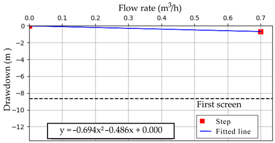 Finally, the efficiency method relies on pumping efficiency as per Jacob’s formula [45]. We plot the step pump test in a chart S/Q vs. Q (where S is the drawdown, in meters, and Q is the yield, in cubic meters per hour) and make a linear interpolation of the data. Parameters B and C are obtained from the fitted line before efficiency is calculated (Figure 3).