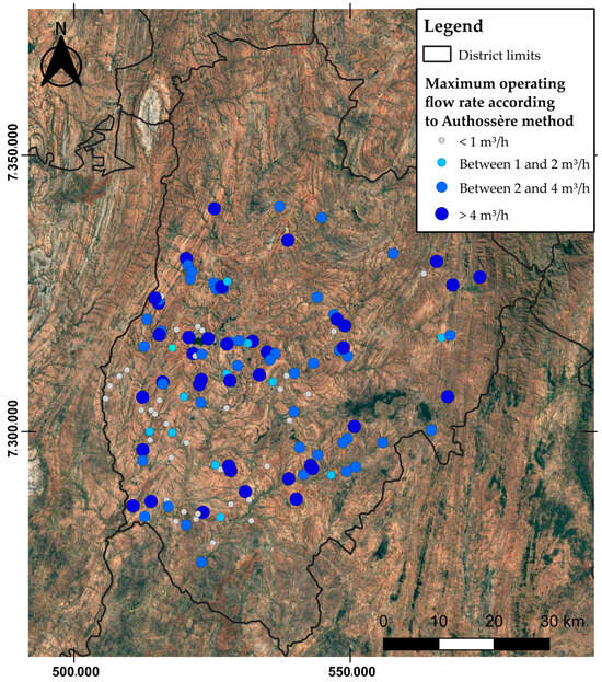 Limitations in input data largely explain why a spatial analysis of borehole yields and suitability is inconclusive. Figure 9 shows the spatial distribution of boreholes and their suitability for the installation of solar pumps, while Figure 10 presents the maximum operating flow rate as per Authossère’s method. There is no clear relationship between lithology and borehole suitability. Out of the 32 unsuitable wells, 27 are in gneiss, leptynite, pyroxenite, marble, charnockite and graphitic leptynite, the two main lithologies in the study area. However, lithological criteria alone do not provide a strong correlation with potential well yield, as 72 of the 82 wells suitable for solar pump installation were in the same materials. It would be necessary to carry out a more detailed analysis on other variables such as aquifer thickness, hydrogeological parameters of the materials or recharge rates in order to relate these yields to spatially distributed variables.