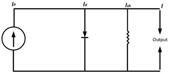 Usually, the modeling approach is implemented using lumped circuit models for PV systems. There are several lumped circuit models for PV available, including the PV double diode model [20], the “Rs” model (which consists of an ideal model with a series resistance), the PV model (which consists of an ideal model with series and shunt resistances), and the ideal PV model (which consists of a current source and a diode). These lumped circuit models are used to model PV modules. Each lumped model demonstrates a varying degree of accuracy and complexity when used to model PV modules. The number of diodes and the use of shunt and series resistances distinguish the various lumped circuit models from one another. There is considerable variation in the methods used to find the parameters of these lumped models. A lumped model’s complexity is directly correlated with the quantity of parameters that require identification. The lumped model’s complexity grows together with the complexity of the methods used to calculate its parameters and execution time. The solar cell is the only energy source shown in Figure 2.