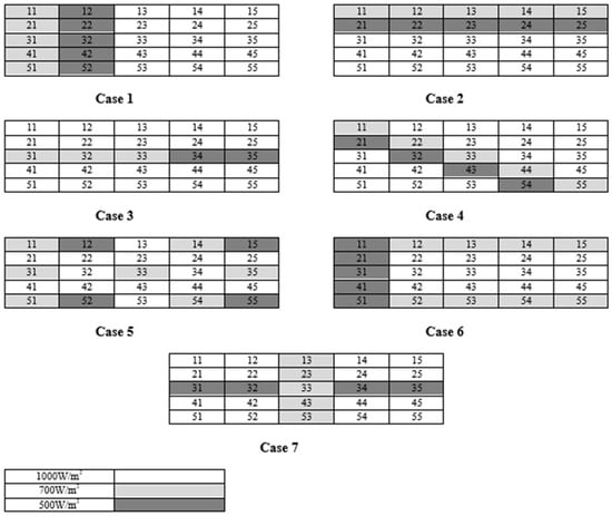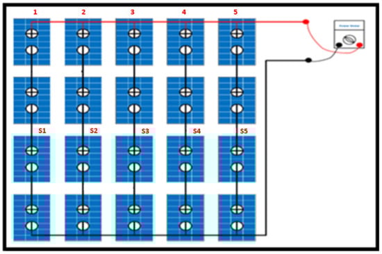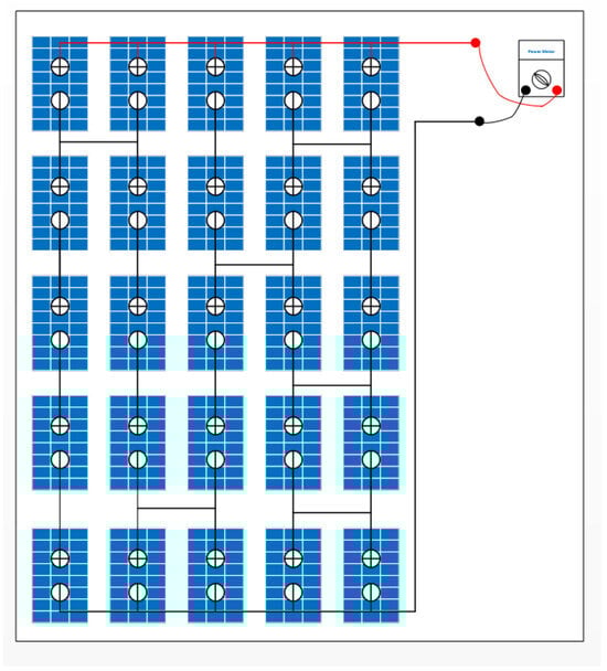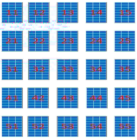 A 5 × 5 PV array, comprising a total of 25 modules, was utilized to evaluate the performance of various PV configuration schemes. The array was arranged in a matrix with 5 rows and 5 columns, as illustrated in Figure 3. Each module was assigned a unique number in the matrix to facilitate the analysis. The maximum irradiance level considered for the modules was 1000 W/m2, which is the standard test conditions (STCs) for photovoltaic modules, as highlighted in white color in Figure 3. However, to simulate partial shading conditions, some modules were intentionally set to receive lower irradiance levels, ranging from 700 W/m2 (grey color) to 500 W/m2 (black color). The values of 1000 W/m2, 700 W/m2, and 500 W/m2 are represented with white, grey, and black colors, respectively, as shown in Figure 3. This controlled environment allowed for a comprehensive investigation of how different PV configuration schemes responded to various shading scenarios, enabling the identification of optimal configurations for maximizing energy output under partial shading conditions. By analyzing the performance of each module and the overall array, valuable insights were gained into the effects of partial shading on PV array performance and the efficacy of different configuration schemes in mitigating these effects. The PV array configuration is shown in Figure 4.