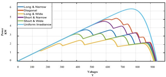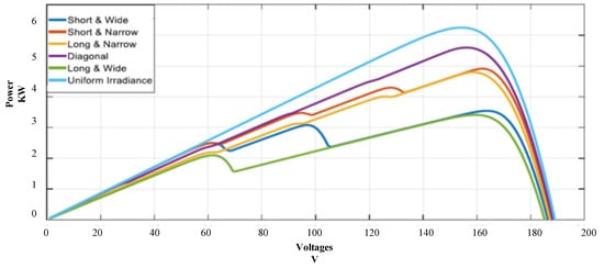 For the series photovoltaic array configuration, a thorough simulation analysis was carried out across a range of irradiance situations, such as partial shading and uniform irradiance. The short–wide, diagonal, long–wide, short–narrow, and long–narrow patterns were among the partial shading conditions that were meticulously modeled to resemble actual situations. The results of the P-V curves in Figure 6 give an overview of the efficacy of the series photovoltaic array arrangement in various shading scenarios. According to the modeling results, with uniform irradiance, the series arrangement may produce a maximum power output of 6250.48 Watts. Yet, depending on the shading pattern, the peak power production fluctuates dramatically under partial shading situations. As illustrated in Figure 6, the series configuration specifically produced a peak power of 5120.8 Watts under diagonal shading, 4742.8 Watts under short–narrow shading, 3708.55 Watts under long–narrow shading, 3295.81 Watts under short–wide shading, and 2627.16 Watts under long–wide shading. These findings show the impact of partial shading on the performance of photovoltaic arrays and emphasize the necessity of optimum layouts to lessen these impacts.