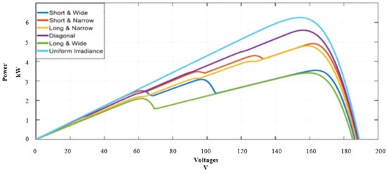 A thorough simulation analysis was carried out for the series–parallel photovoltaic array architecture under a range of irradiance scenarios, such as partial shading conditions (PSCs) and uniform irradiance. Carefully modeled to resemble real-world situations, the PSCs featured short–wide, diagonal, long–wide, short–narrow, and long–narrow patterns. In Figure 7, the results of the P-V curves for each circumstance are plotted, giving an overview of the efficiency of the series–parallel setup under various shading scenarios. According to the simulation results, the series–parallel design may produce up to 6249.4 watts of electricity when exposed to uniform irradiance. However, depending on the shading pattern, the peak power production fluctuates dramatically under partial shading situations. With regard to the series–parallel configuration, as illustrated in Figure 7, the maximum power generated under diagonal shading was 4996.95 Watts; under short–narrow shading, it was 4683.7 Watts; under long–narrow shading, it was 3973.12 Watts; under short–wide shading, it was 3325.56 Watts; and under long–wide shading, it was 3092.7 Watts. These findings show the effects of partial shading on photovoltaic array performance and emphasize the necessity of optimum layouts to lessen these impacts. The series–parallel design is a good option for real-world applications since it performs more consistently under various shading situations.