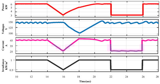 However, between 8 and 10 s, there was a gradual decrease and subsequent increase in the irradiance. This variation caused the power output to decline and then rise accordingly, demonstrating the ability of algorithm to adapt to changing conditions. At the 12th second, a sudden drop in irradiance from 1000 Watts per square meter to 500 Watts per square meter resulted in a sharp decrease in power output from 6250 Watts to 3125 Watts. The P&O algorithm effectively tracked this abrupt change, ensuring that the system operated at its maximum potential under varying irradiance conditions. This dynamic response is illustrated in Figure 10.