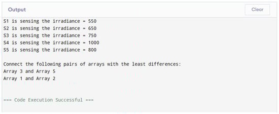 A microprocessor was employed to compare the irradiance levels across five photovoltaic (PV) arrays (1–5), as illustrated in Figure 14. The sensors were mounted on each PV array and named S1, S2, S3, S4, and S5 to measure the irradiance level on each PV array. The irradiance levels of each array were measured using PV-mounted sensors (S1–S5), as shown in Figure 15. The code output revealed the interconnection pattern that minimized the irradiance differences among the arrays. However, the current study had limitations due to the control capabilities of the microprocessor. It could only compare irradiance levels and lacked the functionality to physically switch outputs and establish interconnections. This research is ongoing, aiming to address this limitation by training a machine learning tool. The intelligent network will compare the irradiance levels at the module level and dynamically configure the array with optimized and consistent irradiance across its components.