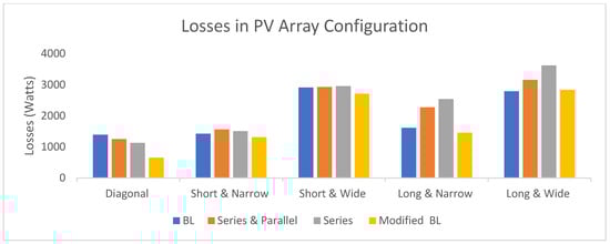It can be observed from the P-V characteristics illustrated in Figure 6 to 9 under uniform and PSCs that the maximum powers were achieved under the modified bridge-linked (BL) configuration. Referring to the tabulated data in Table 2, it is evident that the modified bridge-linked (BL) configuration exhibited superior performance, yielding the lowest losses under various shading conditions, including short–wide, diagonal, long–wide, short–narrow, and long–narrow. Thus, the Modified BL arrangement is the best option due to its adaptability and versatility to different shading circumstances. A complete evaluation highlights the importance of exactly examining different array configurations under diverse shading conditions to determine the optimal setup.