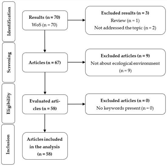 The search yielded 70 results, from which three were removed, because one corresponded to a review, and the other two did not approach the subject of this work. This allowed us to obtain 67 articles that were reviewed individually to confirm the presence of the keywords, whether in the title, abstract, keywords, or body of the document. After this, nine articles were excluded, since they did not address the ecological environment, but the organizational environment. Finally, it was possible to obtain a database with 58 articles published in the selected period (Figure 1).