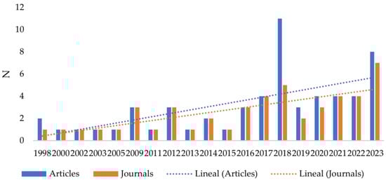 The publication data, including authors, yearly publications, journal distributions, and research areas, were compiled into an Excel file and then exported to a text format. This data was subsequently analyzed using the Bibliometrix R package (Version 4.3.0), which facilitates the creation of tables and network-based maps for further analysis. Then, the contributions made by the research of Dote-Pardo and Ceballos-Garrido [] were considered, which allowed a descriptive study to be carried out to analyze the progression of research on this topic over time.