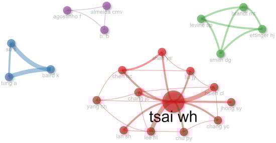 The nine authorship networks detected are dispersed, the largest being the one made up of Tsai, W.H. (National Central University, Taiwan), Jhong, S.Y. (National Central University, Taiwan), Lee, H.L. (Vet Affairs Council Tainan Vet Home, Taiwan), Chang, Y.C. (National Taitung University, Taiwan), Shen, Y.S. (Sichuan University, China), Liu, J.Y. (Chinese Culture University, Taiwan), and Chow, Y.W. (National Tsing Hua University, Taiwan). This shows the relevance of institutions located in countries like Taiwan and China. A second identified authorship network is made up of Beatty, E., Belanger, L., Desjardins, A., Dancause, V., Bluteau, A., Bergeron, F., and Berthelot, S. In this case, all the authors are affiliated with Laval University, Canada (Figure 3).