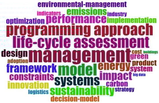 The keywords that appear most frequently in articles published on ABC and environmental impact are management (10 occurrences), life-cycle assessment (eight occurrences), model (eight occurrences), programming approach (eight occurrences), systems (seven occurrences), energy (six occurrences), framework (six occurrences), impact (six occurrences), performance (six occurrences), and sustainability (six occurrences). These 10 keywords together represent 49.0% of the total occurrences of all the keywords that have been used in this topic. These keywords provide an initial notion about the concepts that are most important in the scientific discourse on ABC and environmental impact in the WoS, and how relevant terms related to costs and sustainability are found (Figure 5).