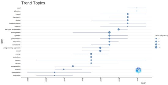 The importance that keywords used in publications in this area of research have acquired has varied over the years. However, there are keywords that stand out above the others, due to their greater permanence over time in publications on ABC and environmental impact. Words such as system, optimization, industry, impact, carbon, sustainability, implementation, design, management, emission, energy, and indicators, have received greater attention from the scientific community, showing permanence over time, highlighting at least four continuous years of research (Figure 6).