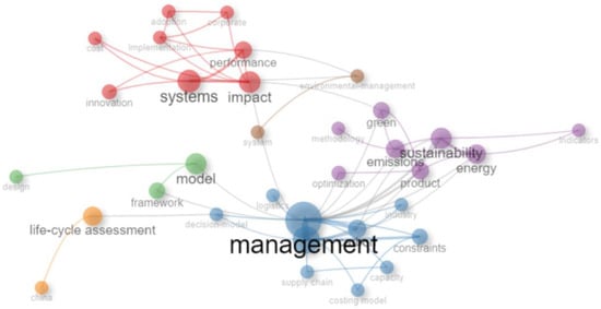 When analyzing the Keywords Plus networks, five clusters can be identified. The first cluster (blue) is made up of words such as management, carbon, constraints, costing model, logistics, decision-model, supply chain, capacity, and industry. The second cluster (red) is made up of keywords such as systems, impact, performance, innovation, implementation, corporate, adoption, cost, environmental management, and system. The third cluster (purple) contains the words sustainability, emissions, energy, product, green, methodology, and optimization. The fourth cluster (green) groups the words model, framework, and design. The fifth cluster (orange) contains the words life-cycle assessment and China (Figure 7).
