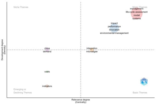 When analyzing the topics graphically, we identified four categories: (i) driving topics located in the first quadrant (top right) and characterized by a cluster network with high centrality and density, highlighting their importance and significant development within the research structure; (ii) niche topics in the second quadrant (top left) with high density but low centrality, suggesting limited relevance; (iii) emerging or declining topics in the third quadrant (bottom left) with low centrality and density, indicating early-stage or marginal development; and (iv) basic topics in the fourth quadrant (bottom right) distinguished by high centrality and low density, making them essential for transdisciplinary research [].