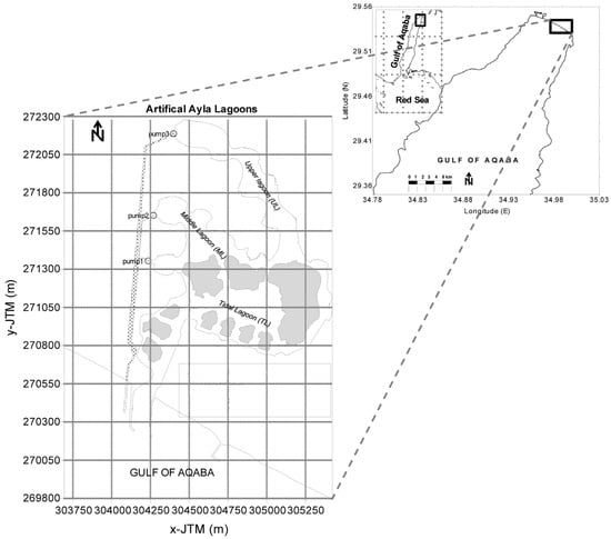 Map of study area of the Ayla Oasis lagoons in the northern Gulf of Aqaba (adopted from Manasrah 2015 []).